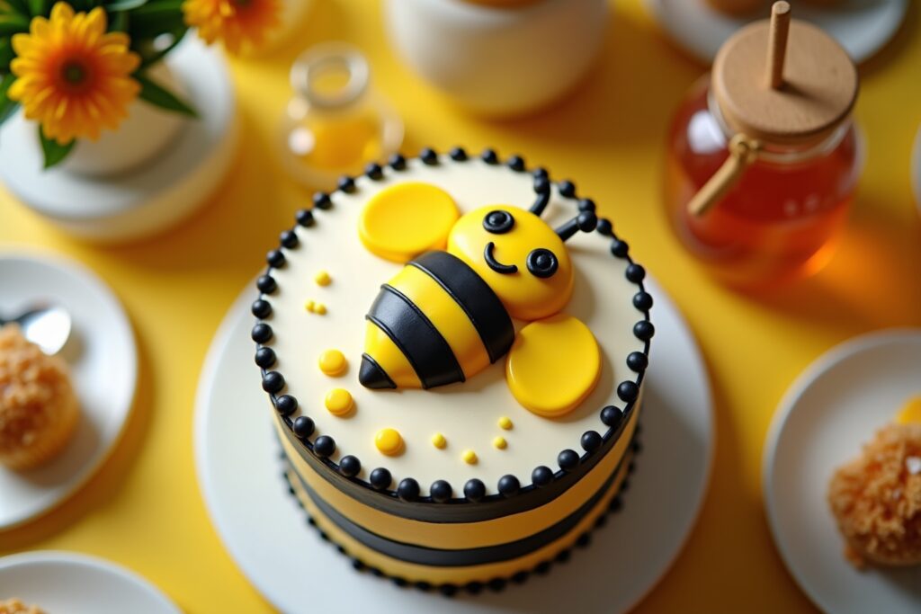 - Honigwabe: Die Torte in Form einer Honigwabe gestalten und mit gelbem Fondant überziehen. Kleine Bienen aus Marzipan formen und auf der Torte verteilen.